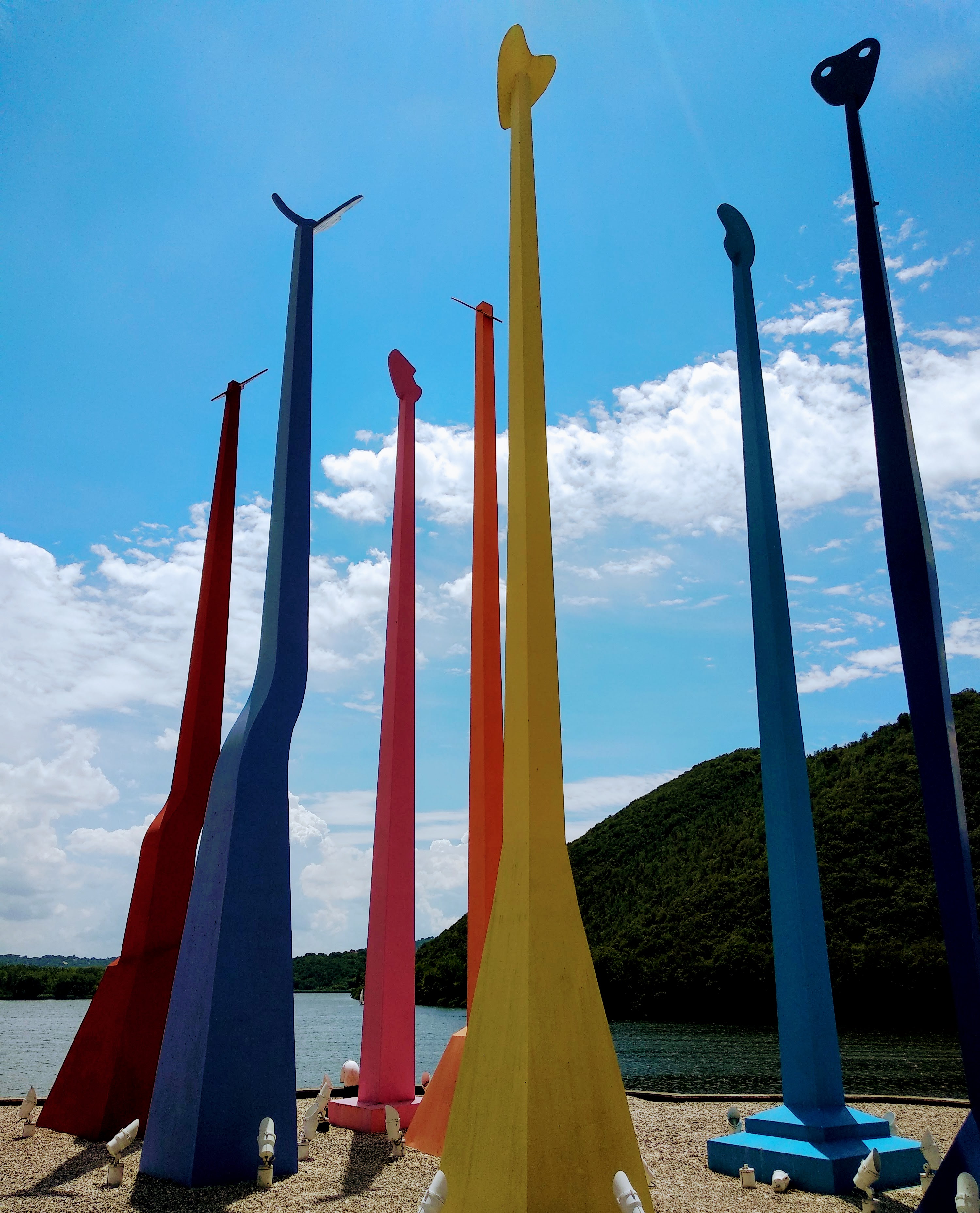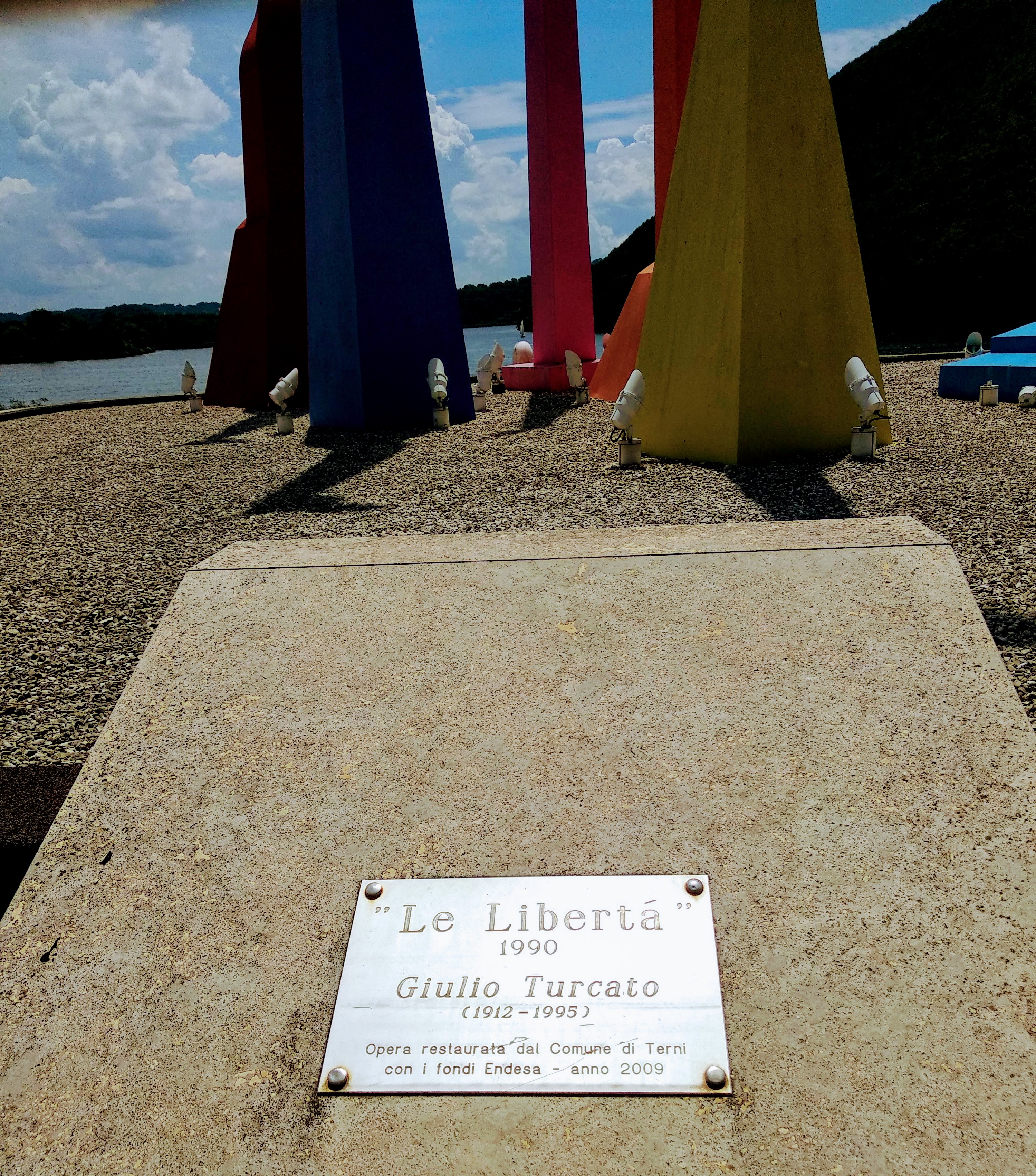 Non sono io ad andare da lei, è lei ad avvicinarsi a me. Mi tirano letteralmente fuori dal pantano dei miei pensieri, 7 Colonne colorate, che svettano in alto, ancorate al suolo e dinamiche allo stesso tempo. Per vederle tutte occorre per forza alzare lo sguardo e guardare il cielo. Dietro di esse lo spettacolo delle acque del lago. Confesso che in quel momento ho percepito che dovevo cogliere un qualche significato che non mi è stato immediatamente chiaro però.