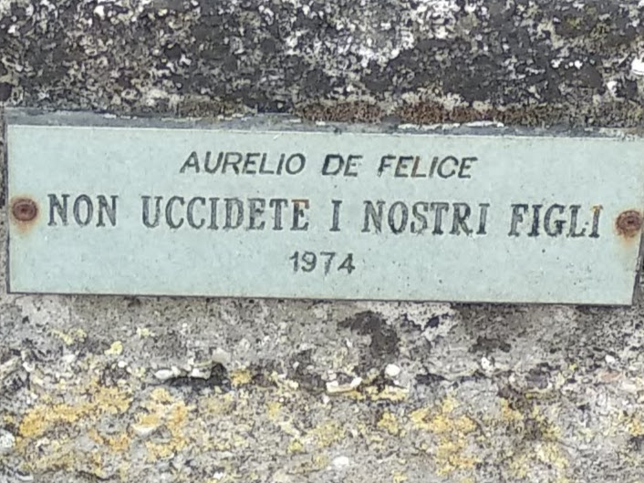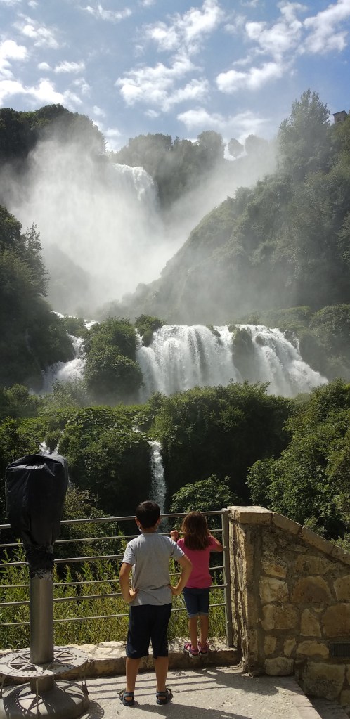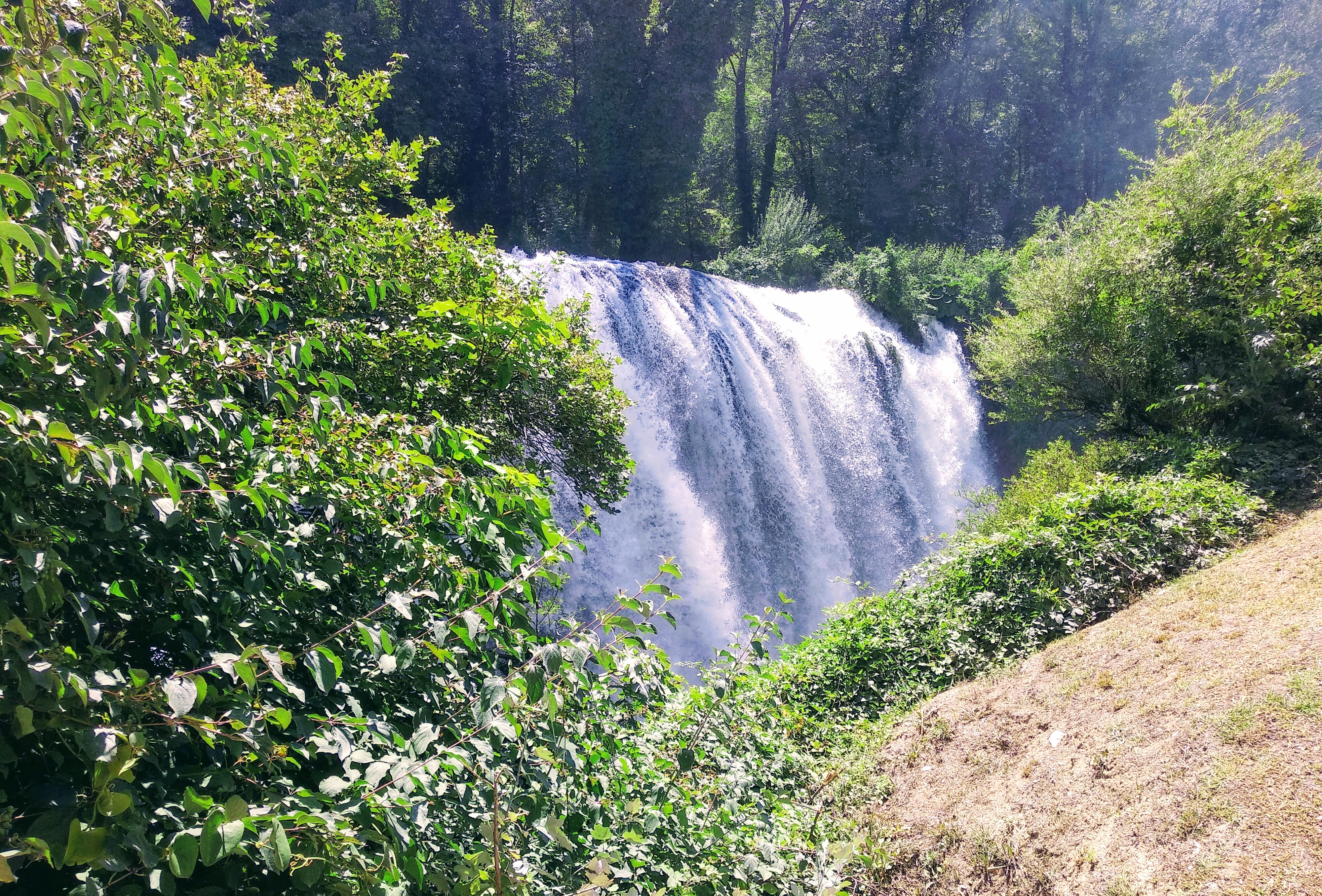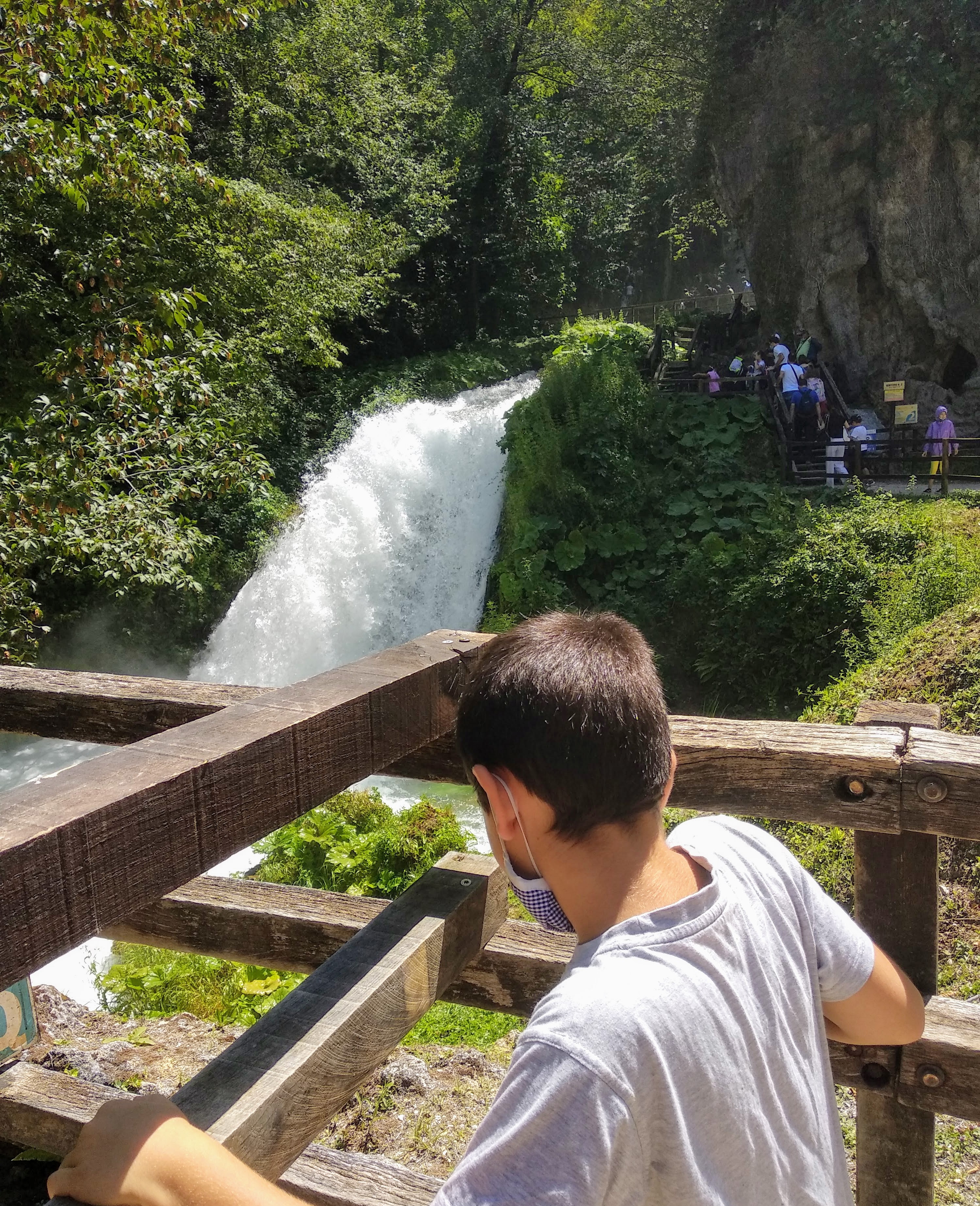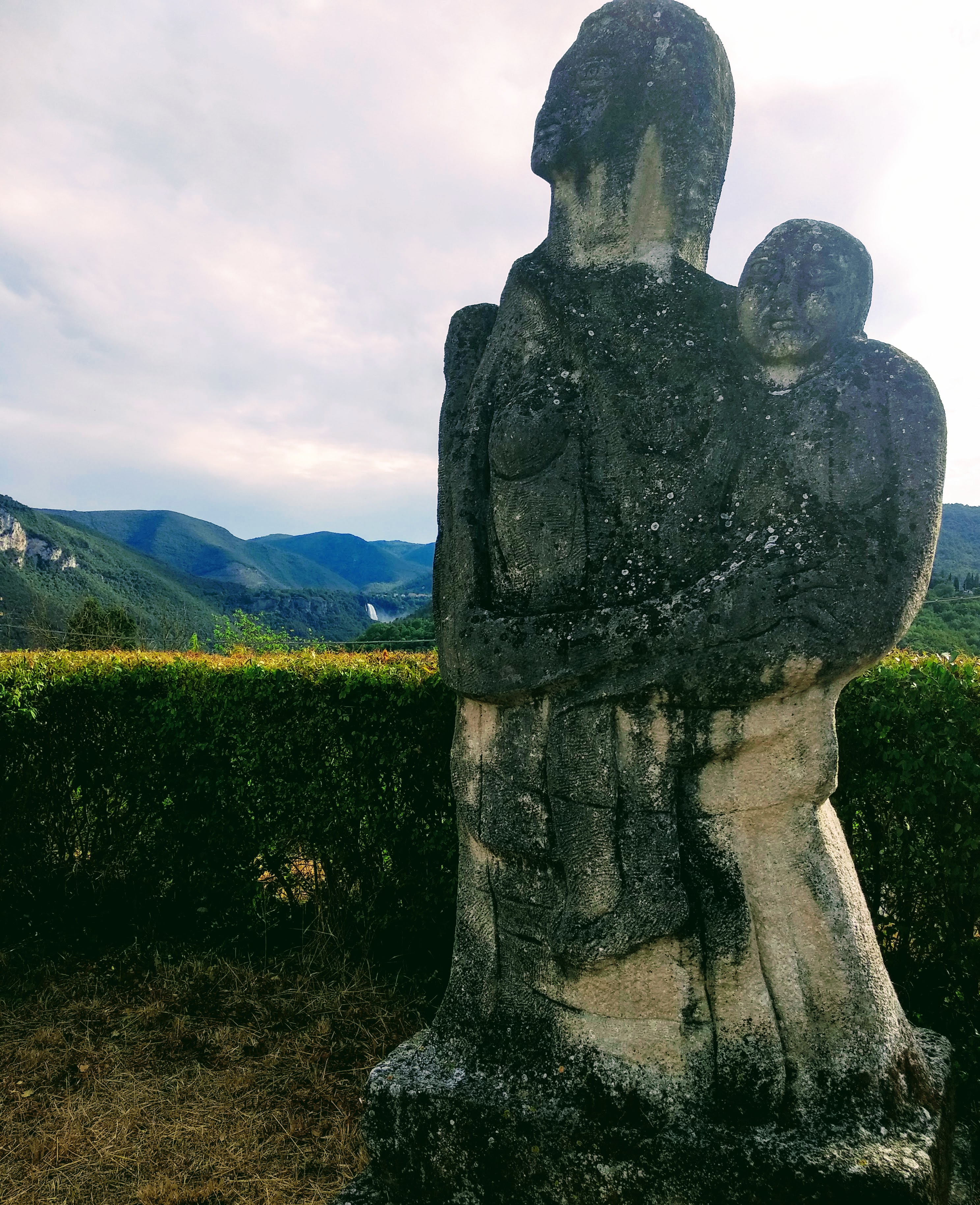 È stato forse per questa mia sordità che il destino mi ha fatto incontrare un altro artista, sempre nella stessa giornata. Dal lago ci spostiamo, infatti, verso Il borgo medievale di Torre Orsina, situato in piena Valnerina ternana e qui, a distogliermi dai miei tormenti, questa volta è la copia della scultura di Aurelio de Felice “Non uccidete i nostri figli”. Per me, che non capisco nulla di arte, essa si è presentata come una enorme pietra con le emerse sembianze di una mamma, il cui volto è rivolto verso l’esterno, quasi a mimare il cenno di chi ti indica la strada, che tra le braccia cinge un bambino. Questa mamma di pietra (in realtà vetroresina, ma vabbè…) mi racconta silenziosamente che quel bimbo è suo figlio e che occorre spostare lo sguardo dietro di lei, verso il meraviglioso scorcio naturale da cui possono vedersi, lontane, le cascate delle Marmore, ben visibili nel loro fragore controllato. Ancora acqua quindi.