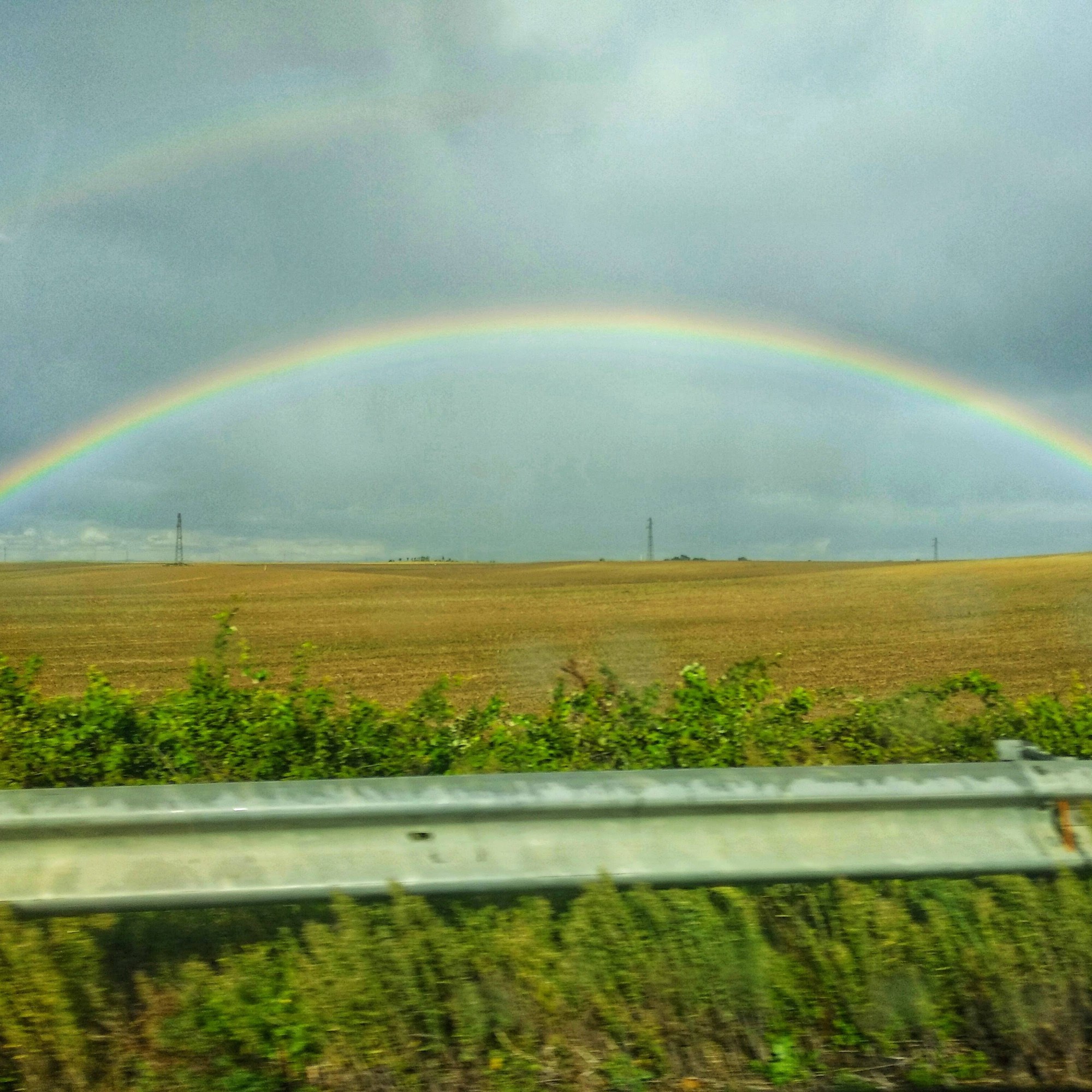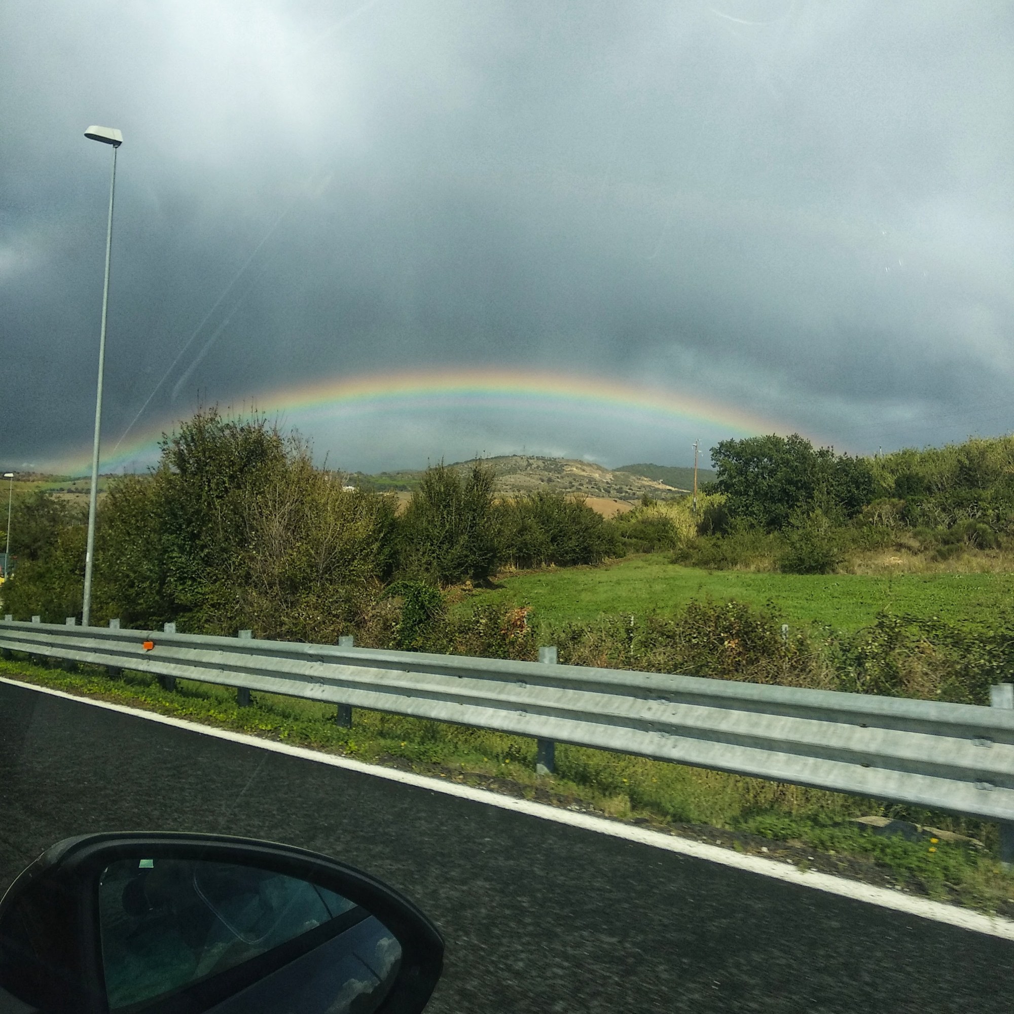 Lentamente, i viaggiatori si lasciarono alle spalle i chilometri di asfalto bagnato e si prepararono a percorrere un futuro che pareva più asciutto; la tempesta sembrava passata. Le nubi cominciarono a far spazio ad un cielo che aveva ritrovato il tipico azzurro sereno e a fianco dell’itinerante compagnia, cominciò a dilatarsi il segnale della pace ritrovata: apparve perfetto, un meraviglioso arcobaleno che non lasciò più la comitiva e la accompagnò per il resto del viaggio.