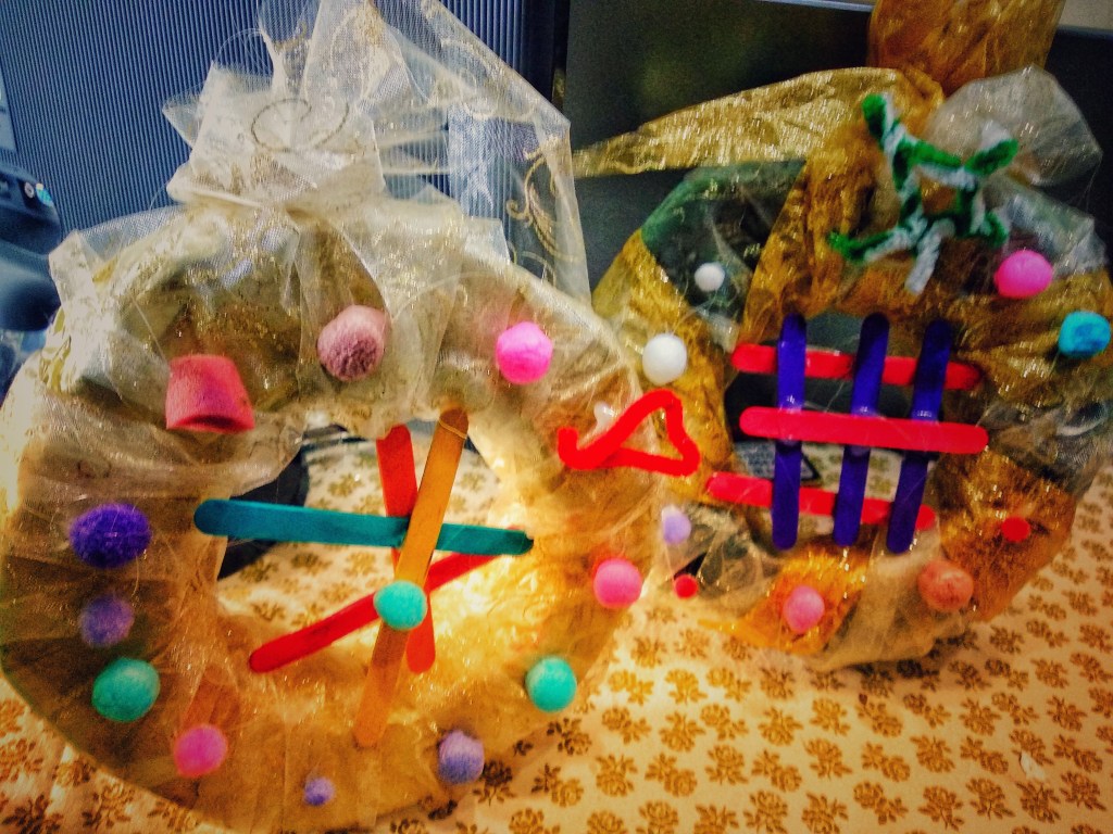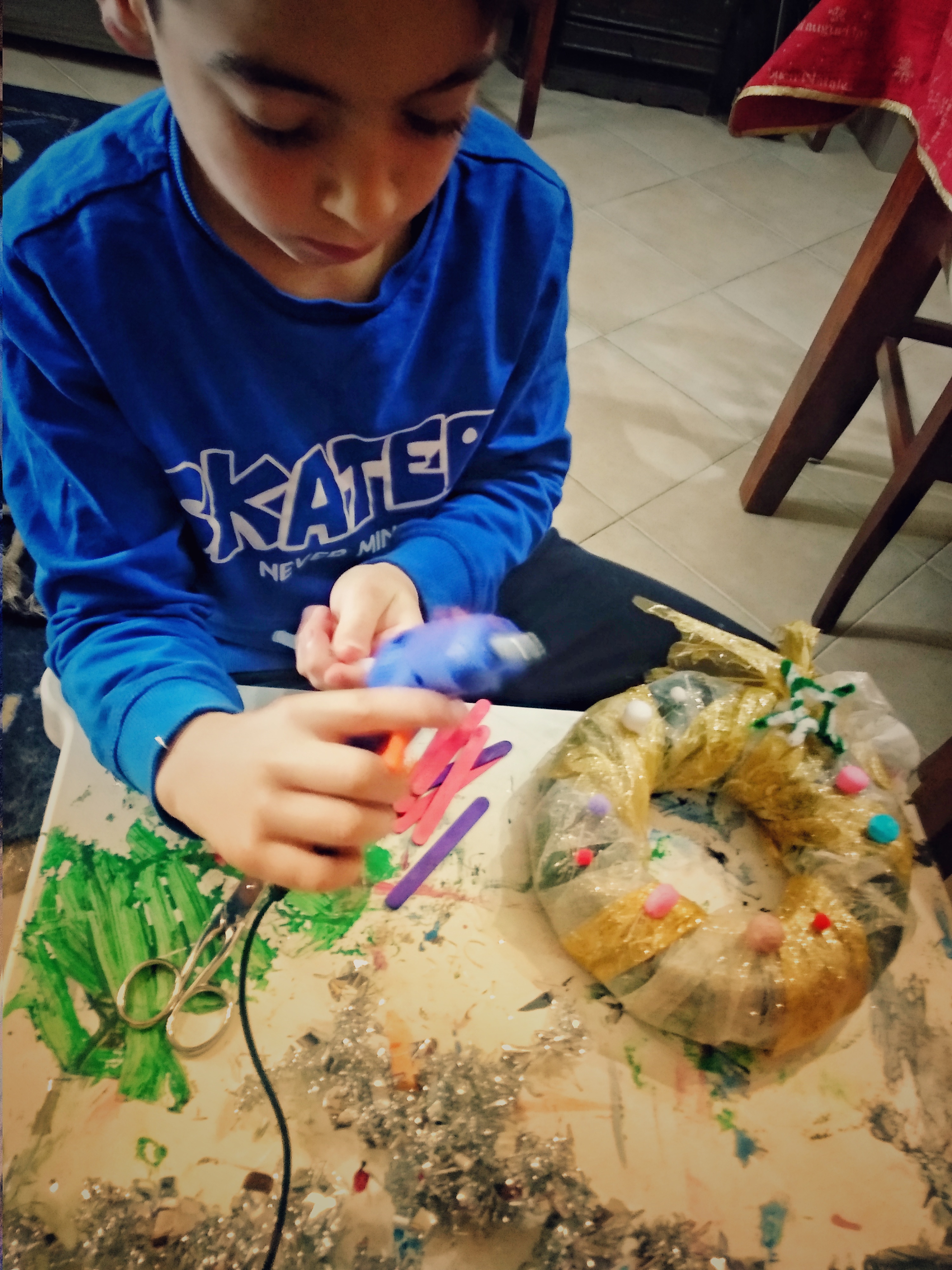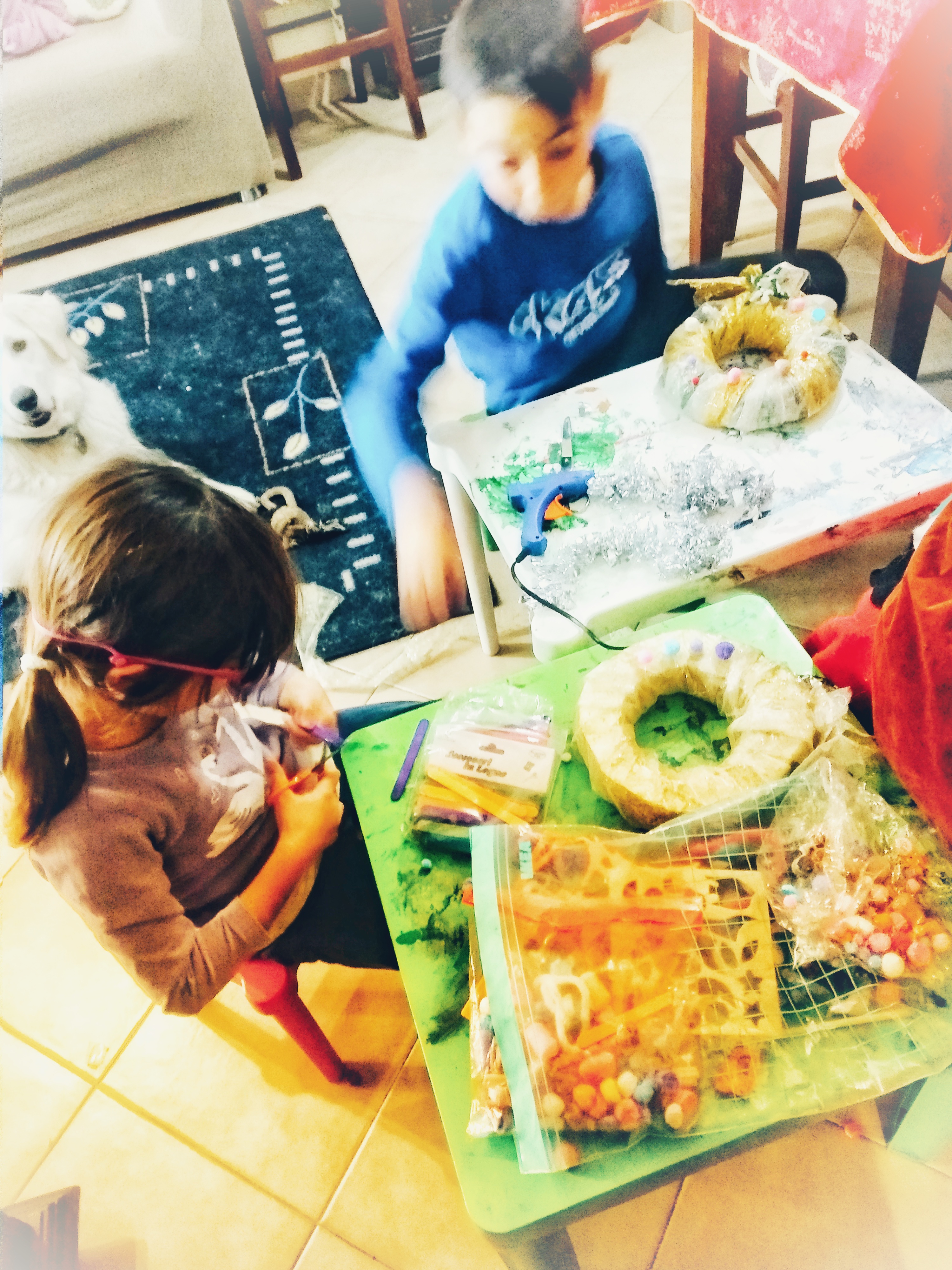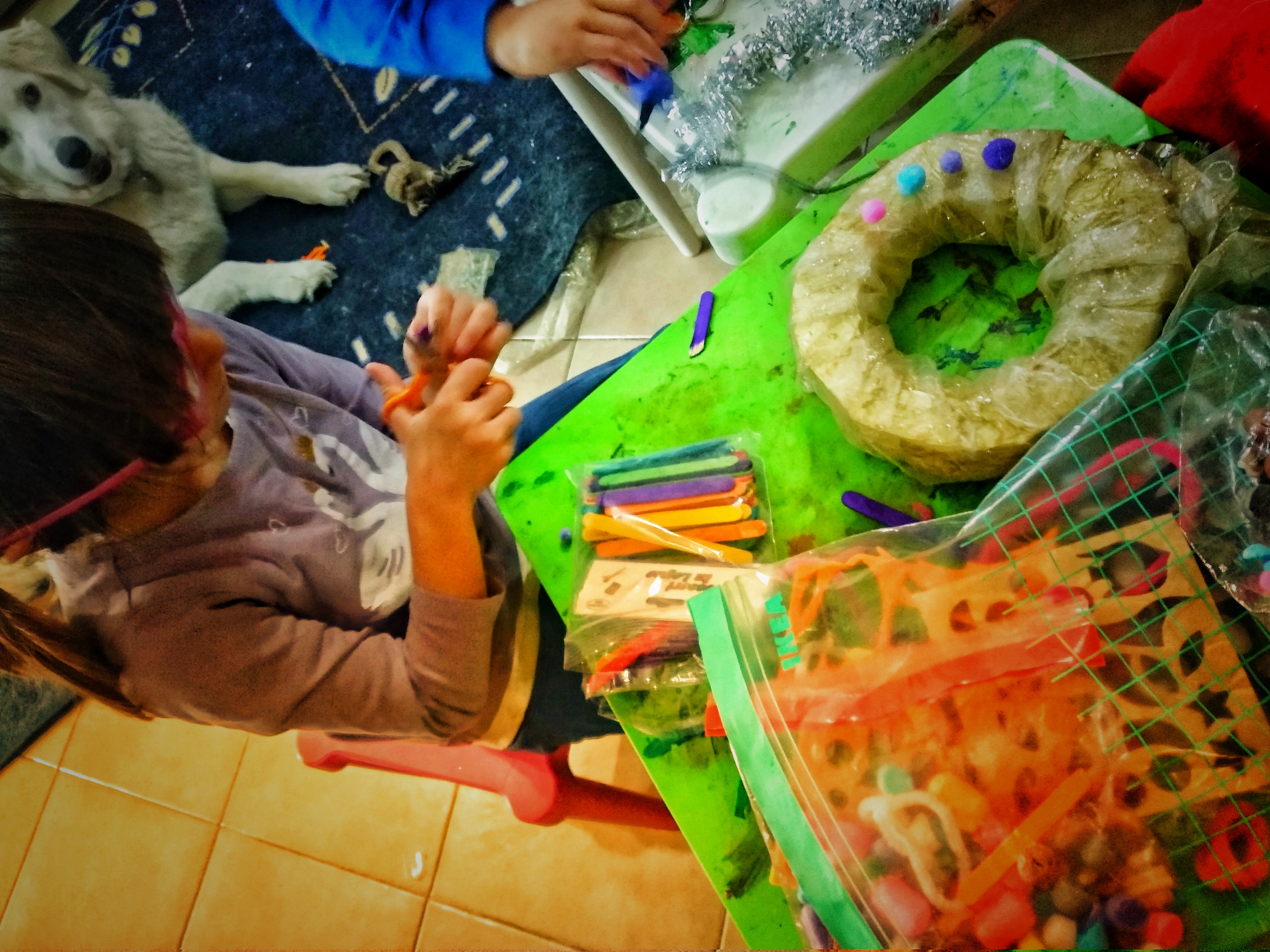 Per trovare i toni festosi, Iniziamo con lavoretti pasticciati, molto lontani dalla perfezione, ma vicini alla estemporaneità del momento: io avevo in mente delle ghirlande natalizie (fatte di polistirolo, carta velina e materiali decorativi vari), gli Gnometti, invece, hanno elaborato vere e proprie opere d’ingegno: ghirlande scaccia incubi… vabbè.