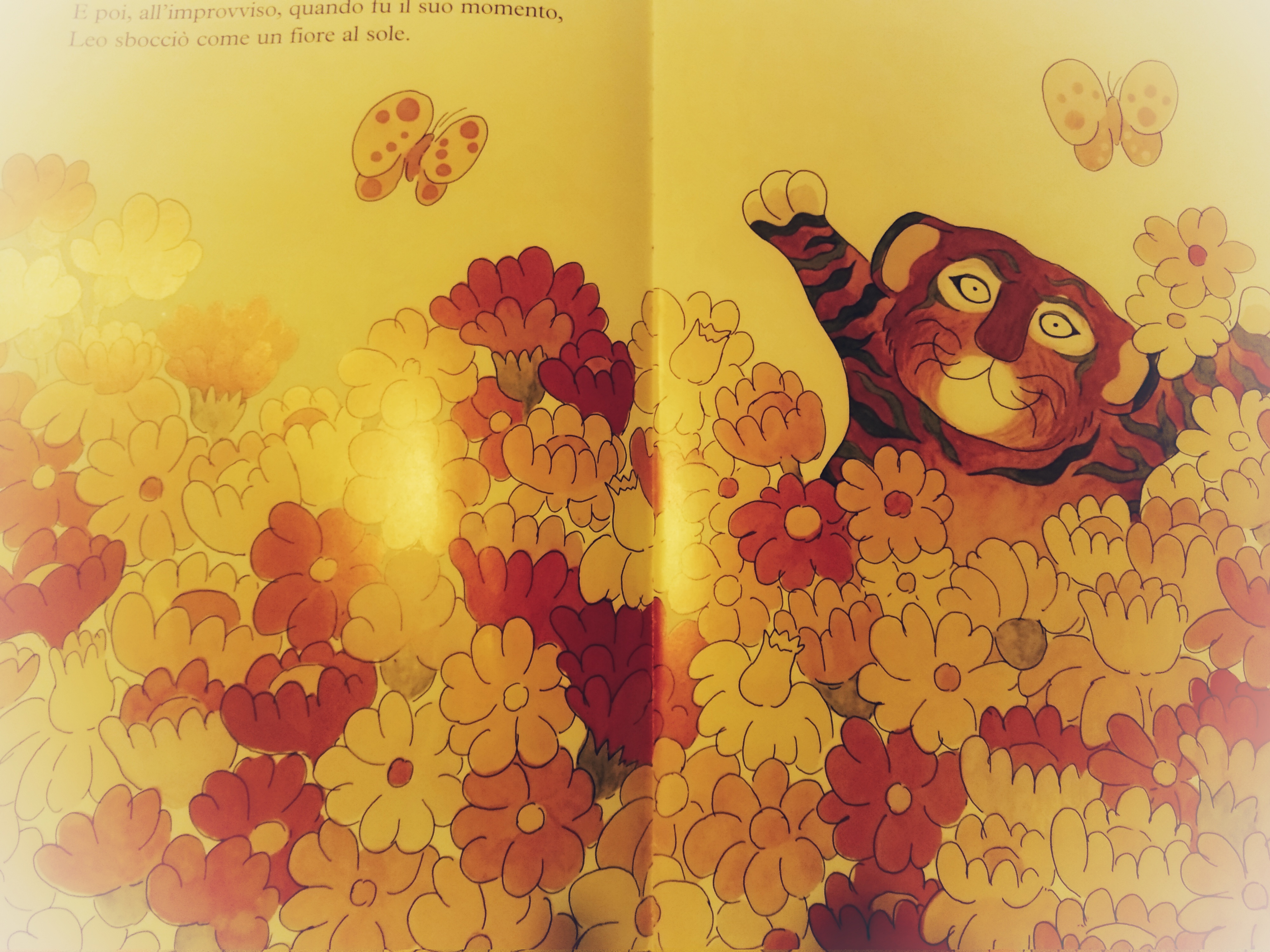 Il libro scelto dalla piccoletta si intitola “Leo”: il racconto di un tigrotto tardivo che prende il suo tempo per sbocciare e poter dire -anche io so fare tutto! -.