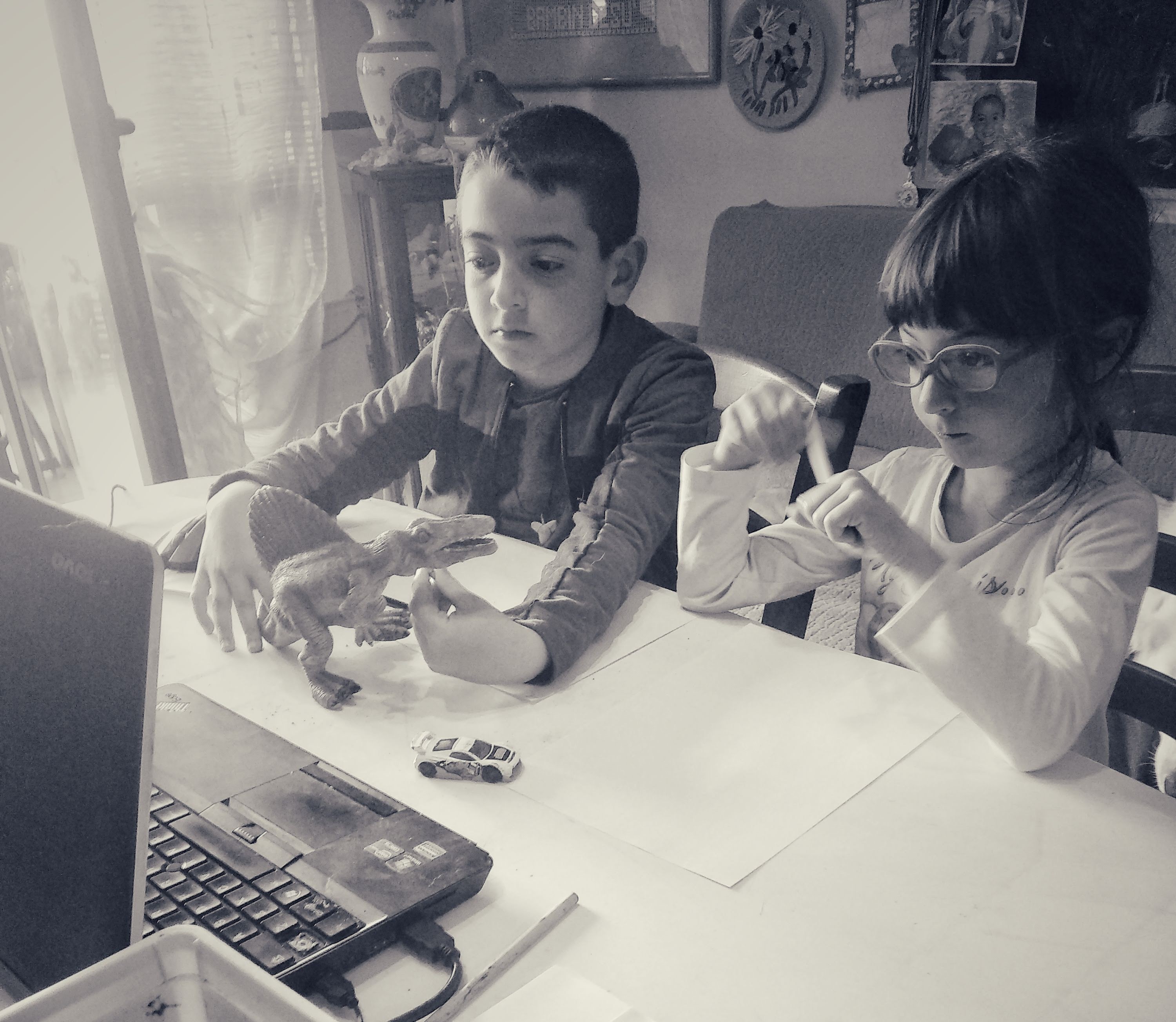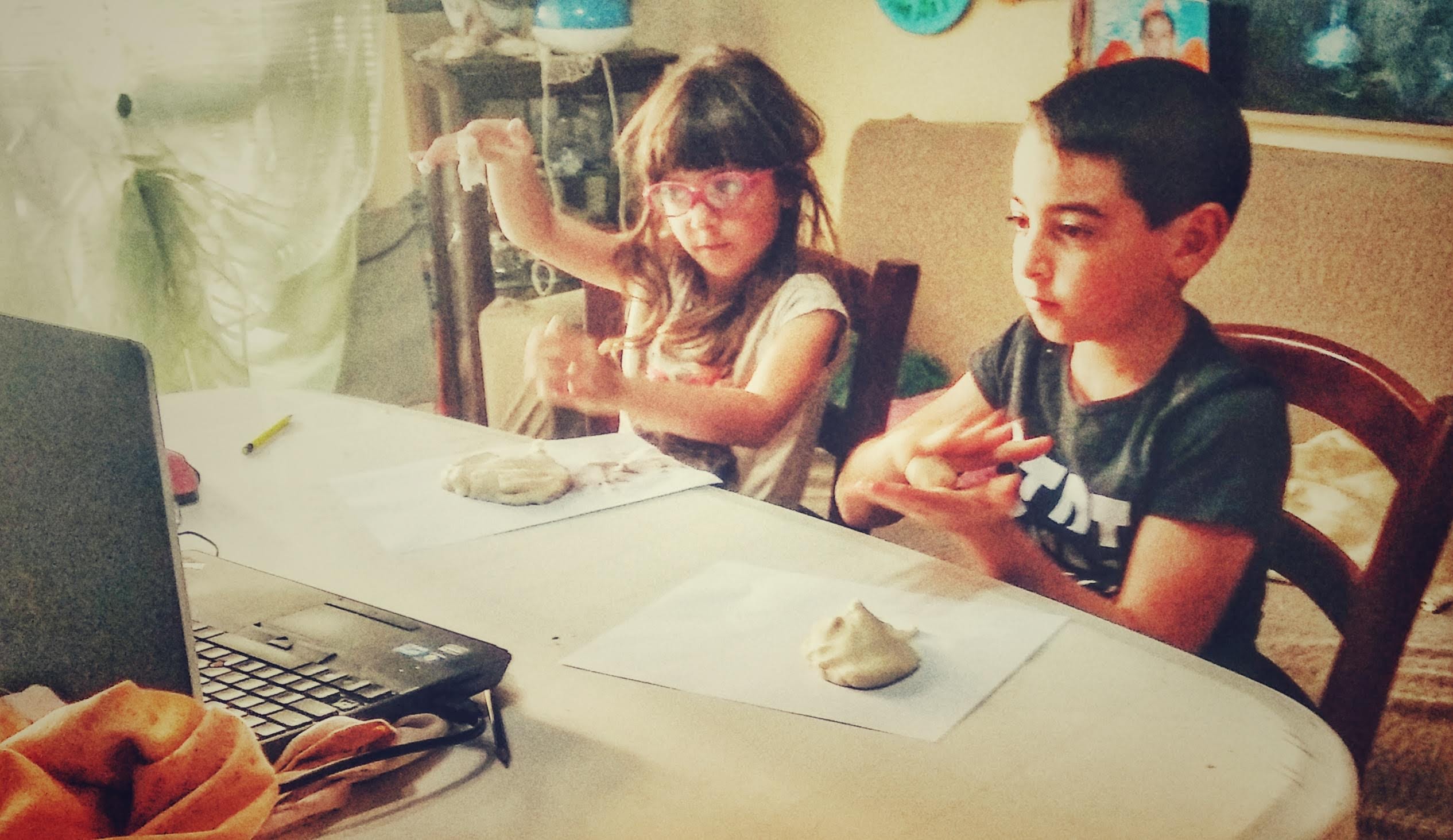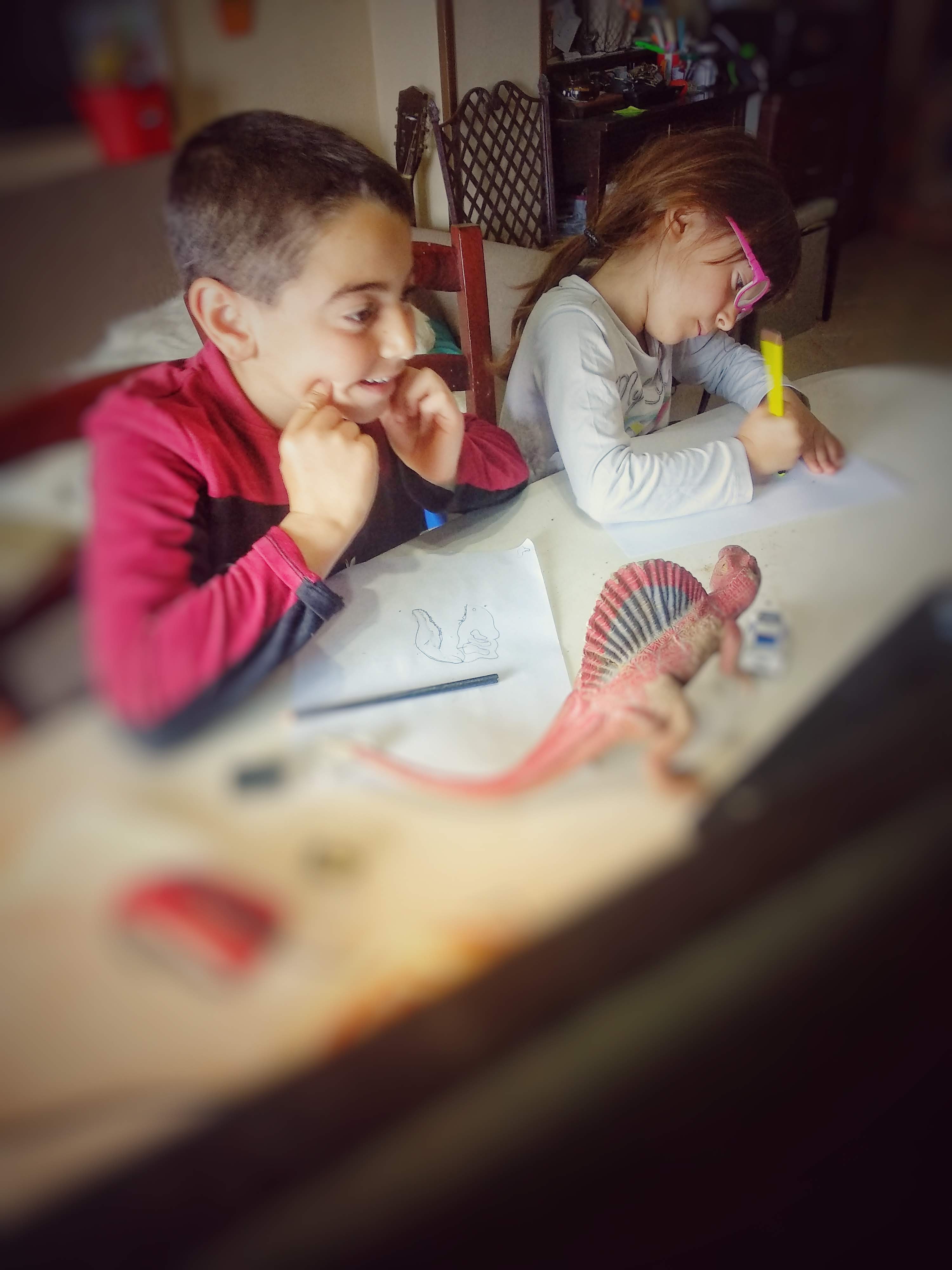 Grazie alla piattaforma Connecting-Kidz abbiamo imparato le tecniche di lavorazione preistoriche del fango (con pasta di sale autoprodotta), abbiamo studiato l’anatomia dei dinosauri (scoprendone di nuovi e imparando che pure loro avevano i muscoli), e abbiamo fatto un dettato correndo per casa fra mille risate e una gran voglia di partecipare.