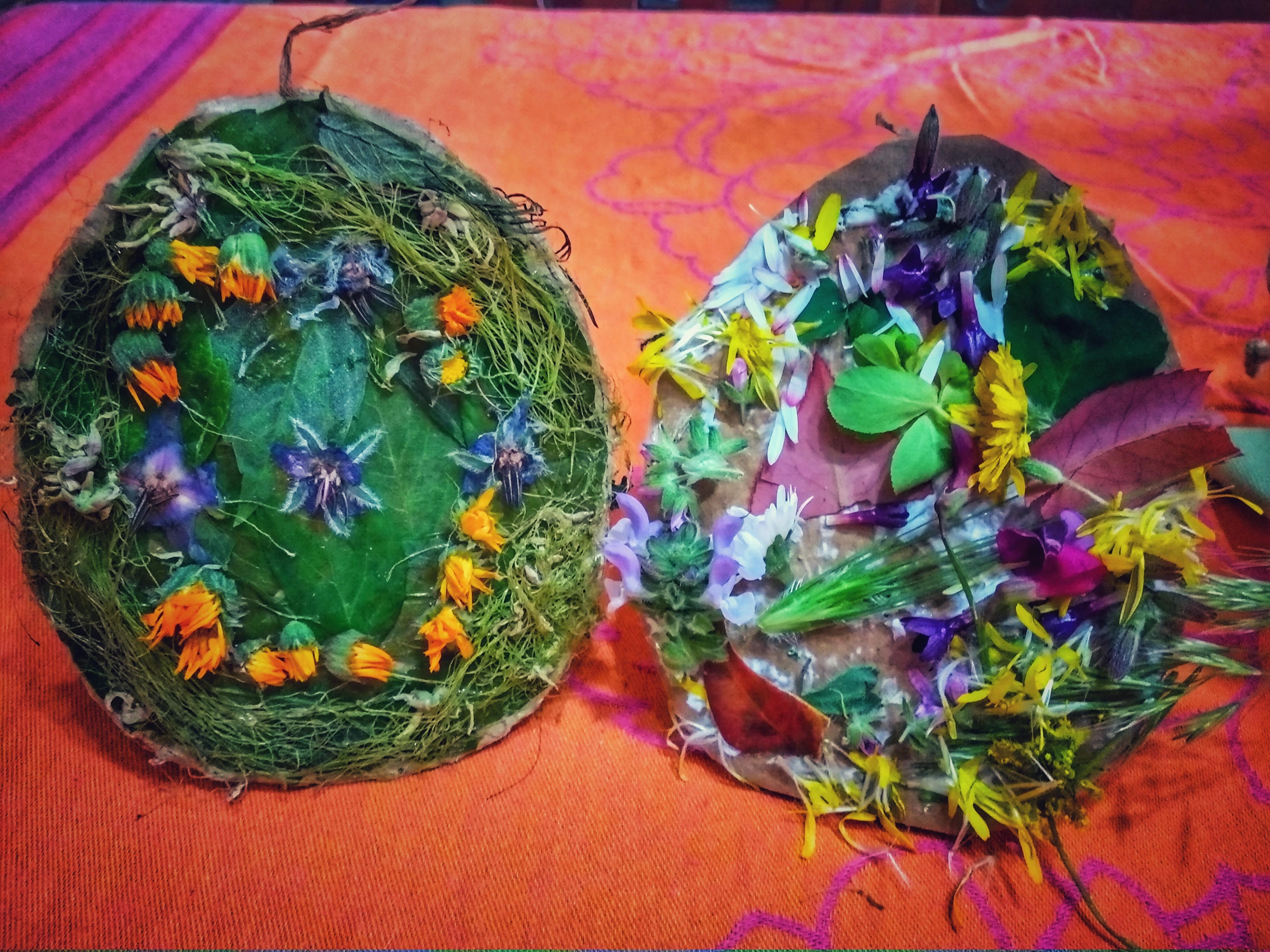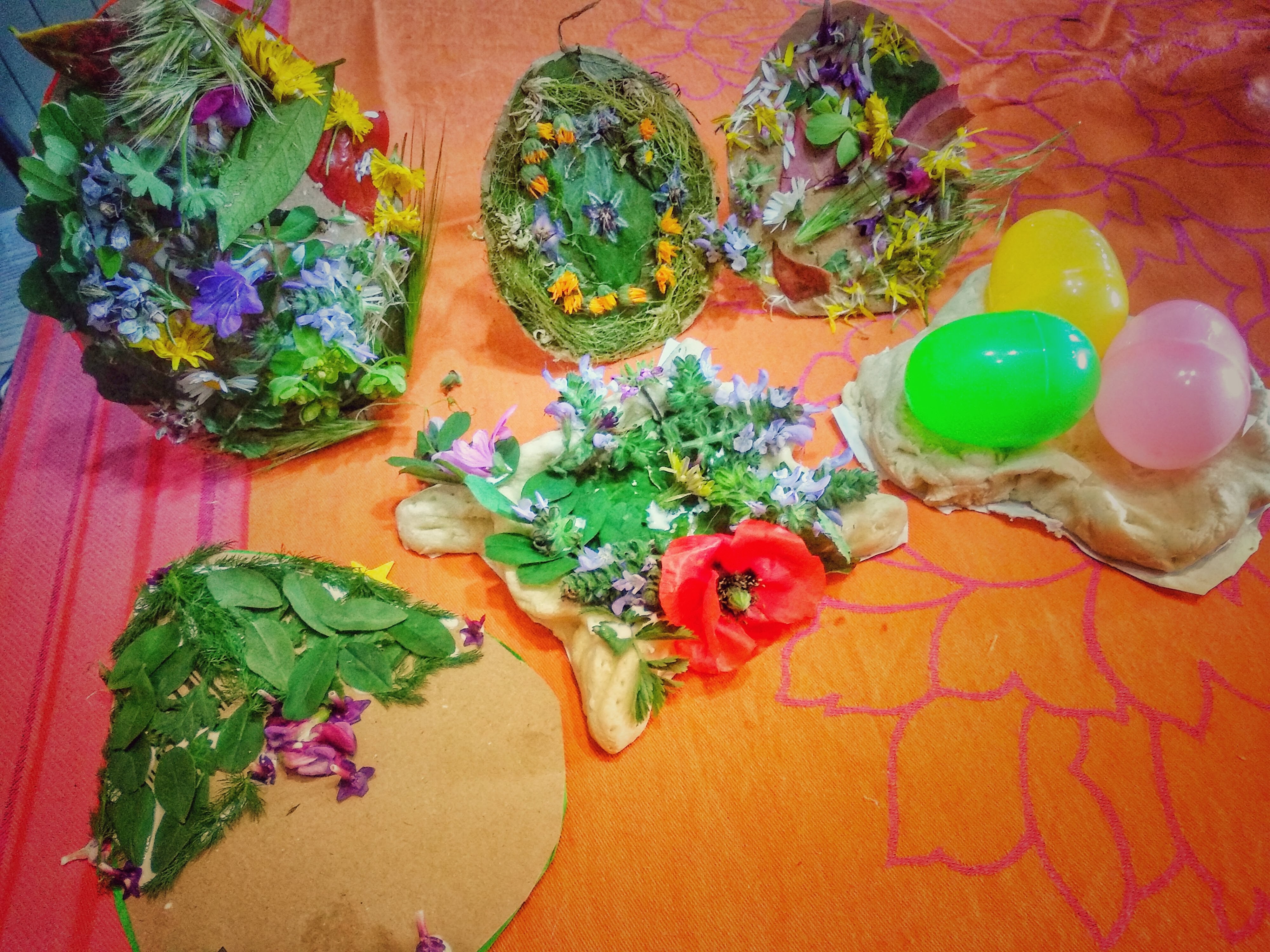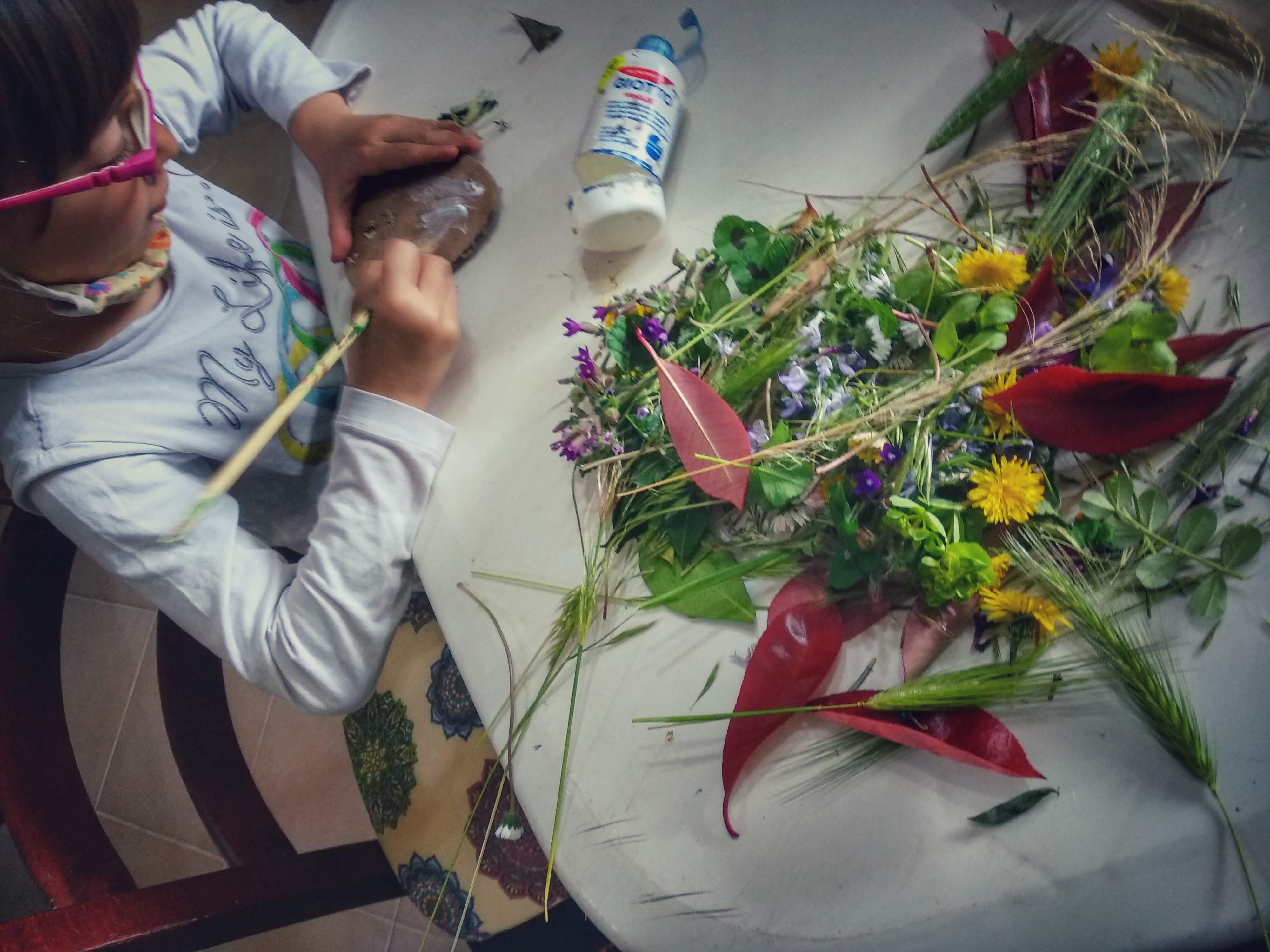 La giornata però è lunga, così abbiamo deciso di portare a casa e fare nostra la tecnica degli amici Gorilla, per continuare le decorazioni naturali delle uova e questo ci ha permesso di uscire a raccogliere il materiale e rilassarci tantissimo per comporle.