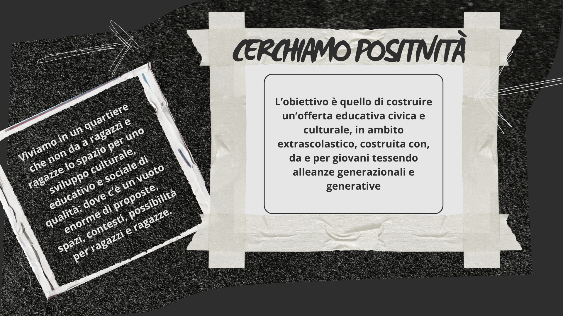 Immediatamente poi ho anche compreso che quel bisogno non riguardava solo me: le stesse parole, lo stesso sguardo, potevano essere utili anche altrove: ad altri genitori irrequieti come me, ad esempio. E poi ancora al mio quartiere, a instaurare relazioni costruttive, o a ideare progetti collettivi.